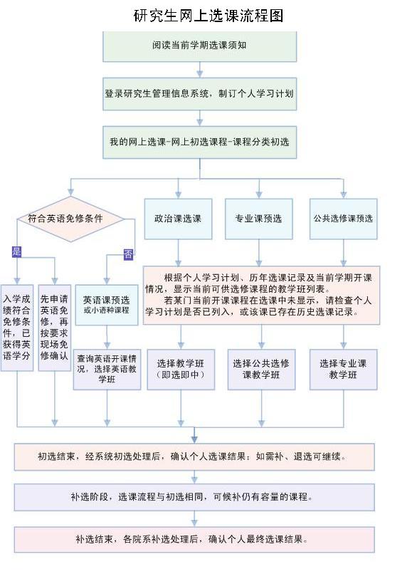 | 初选处理 | 研究生培养处与各学院(系)对初选数据进行处理。 | 19:00后在“选课结果查询”栏确认初选结果。部分课程可能因选课人数不足而停开,请关注网上通知,及时调整个人选课。 |