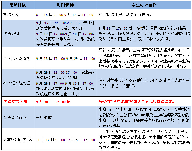 4. 选课期间,全校性的公共课选课事宜请咨询研究生培养处(联系电话:87951396),专业培养方案、个人学习计划制定及审核、专业课选课、管理信息系统登录密码等事宜请咨询所在学院(系)研究生科。