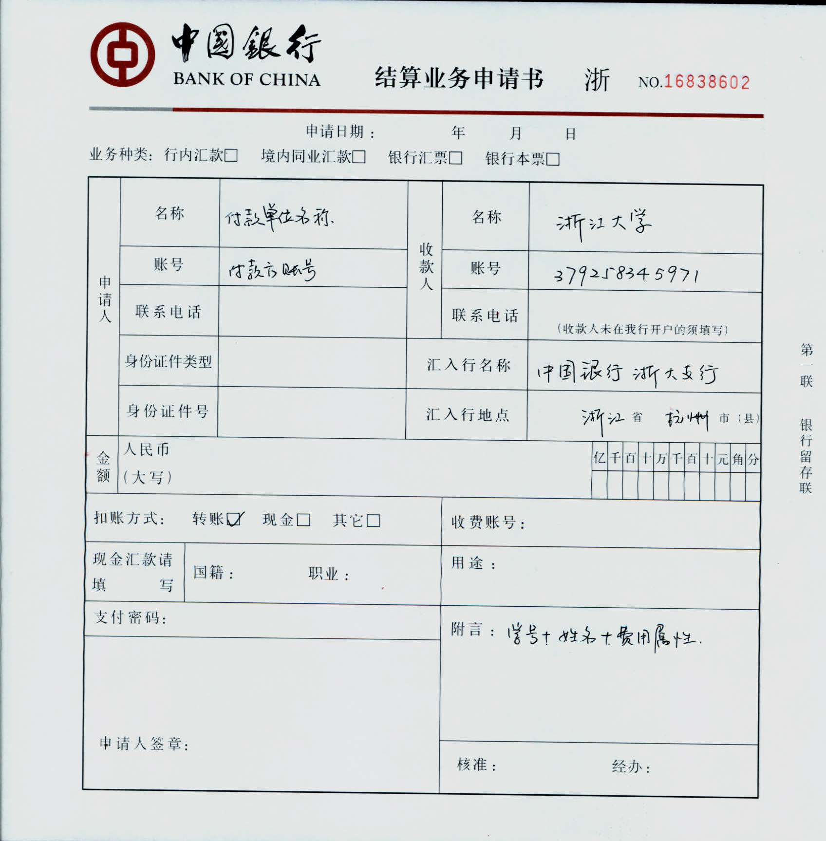 附件1:单位缴费-中国银行结算业务样表(费用属性为:研究生培养费)